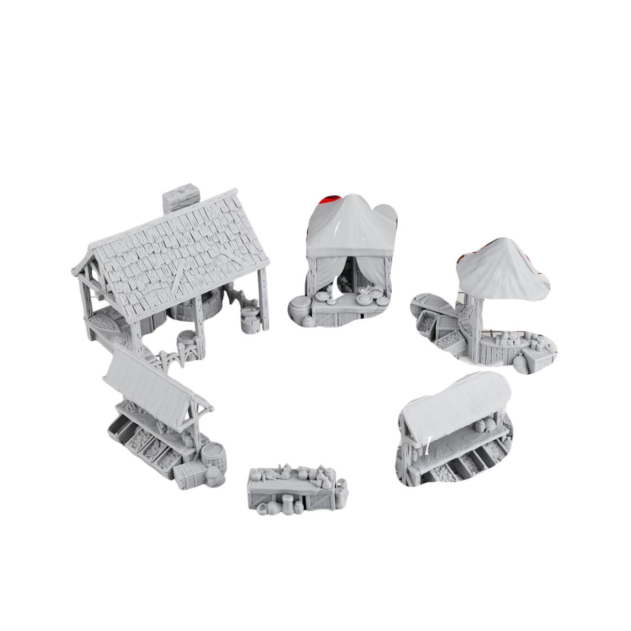 Immerse yourself in the vibrant energy of a bustling fantasy market with this Street Market Terrain Set. Perfectly crafted for tabletop games like D&D and other role-playing adventures, these market stalls, barrels, and crates in 28mm scale add unmatched realism to your village square or town setting.