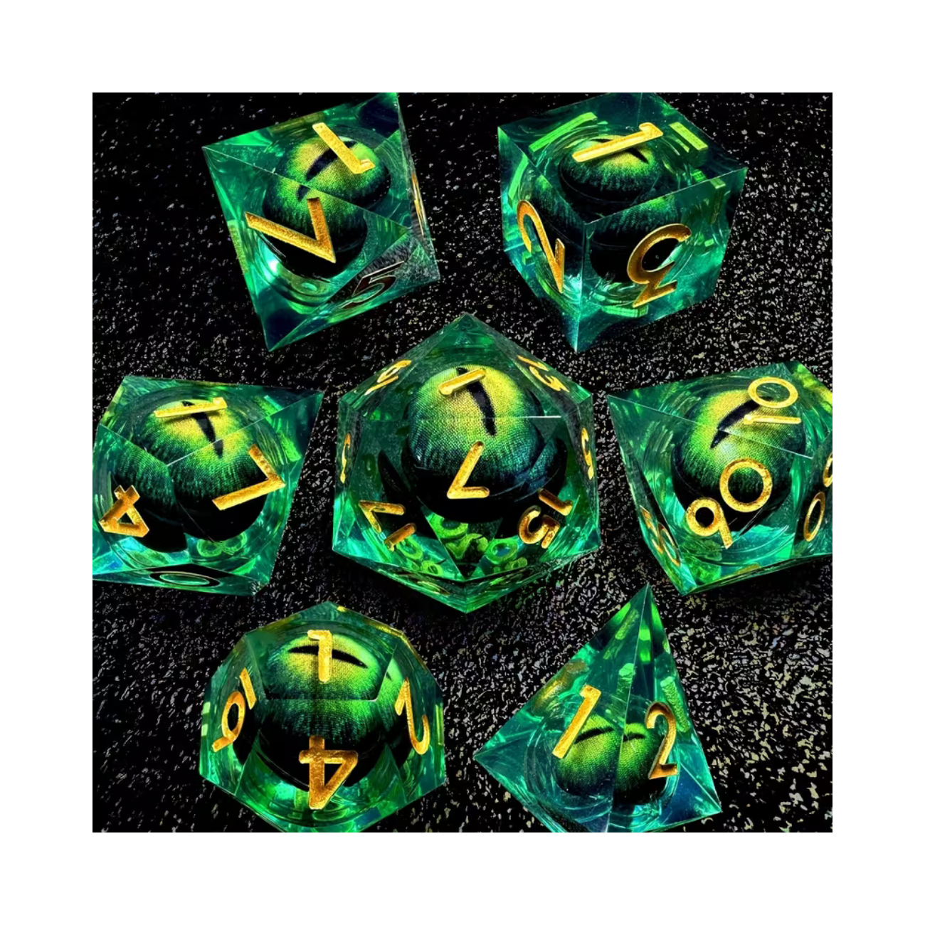 Each dice in this 7-piece set features detailed dragon eye artwork encased in durable resin, ensuring longevity and aesthetic appeal. Their sharp edges provide precise rolls, making them perfect for competitive and casual gameplay alike.