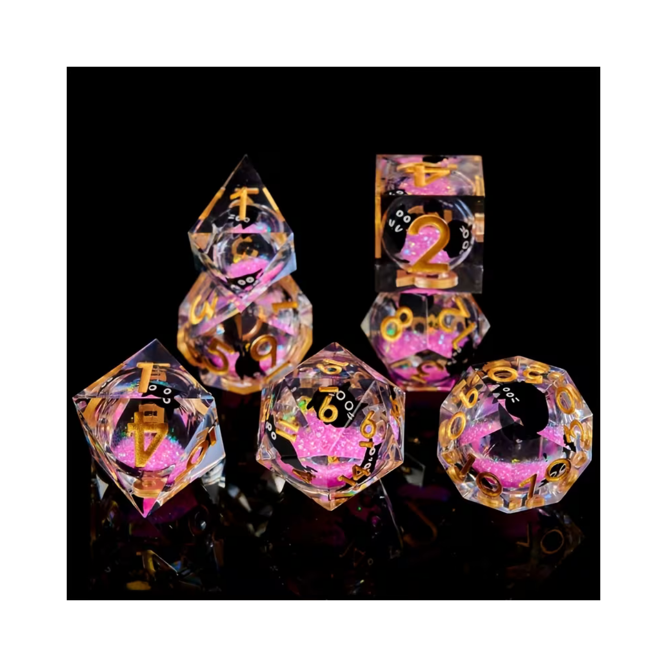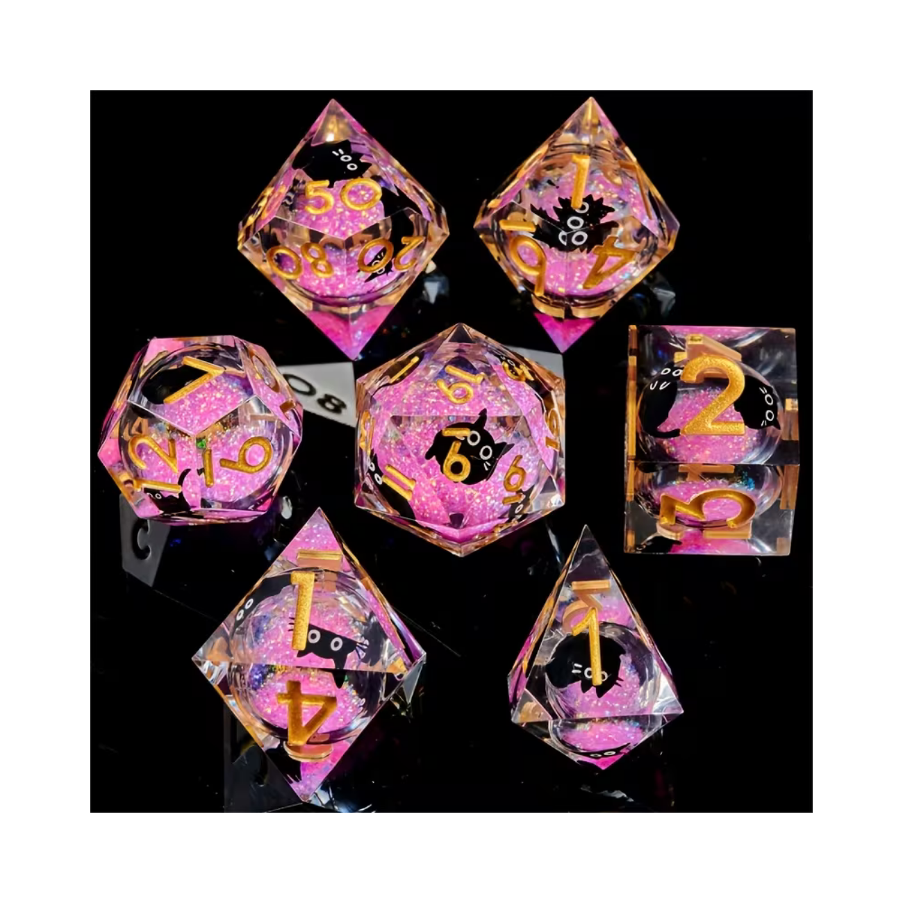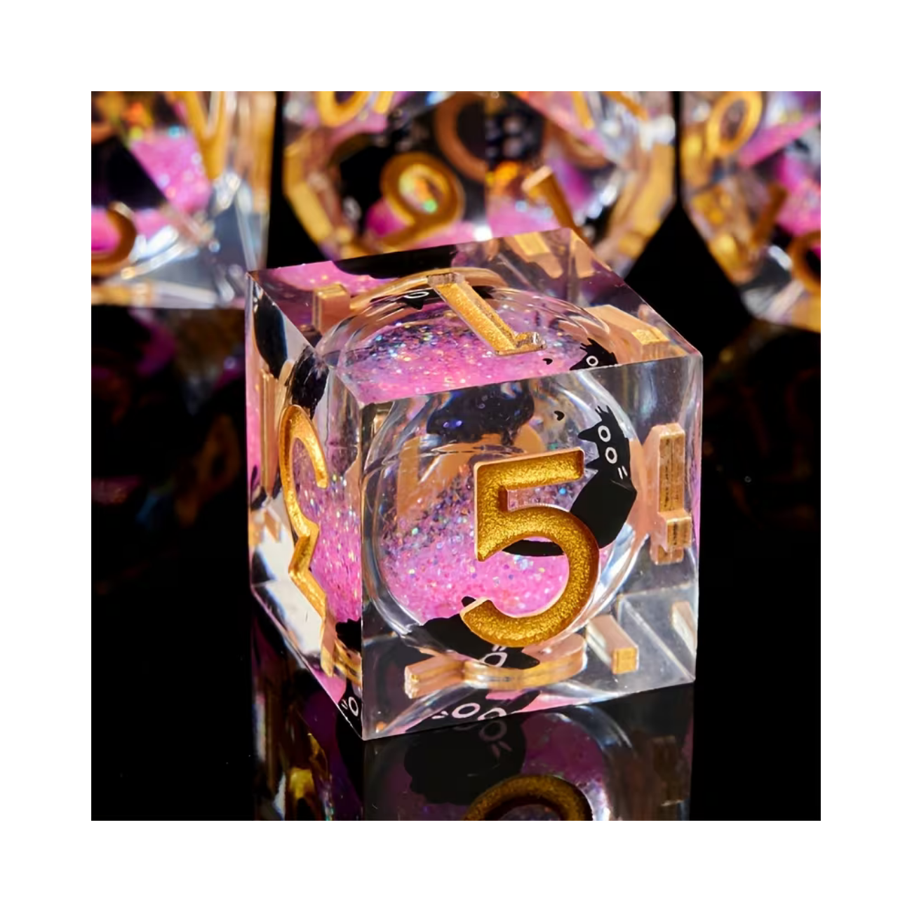 Immerse yourself in the realm of tabletop gaming with this meticulously crafted set of Liquid Core Cat Dice. Featuring a unique galaxy theme, these sharp-edged, resin-crafted dice deliver stunning visual effects that captivate players and Dungeon Masters alike. Whether you’re a fan of D&D, RPGs, or casual tabletop games, these dice are both functional and enchanting, making every roll a spectacle.